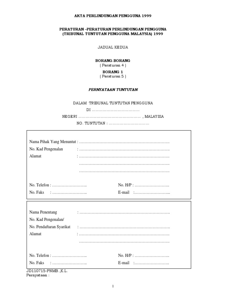 Jika anda mempertikaikan tuntutan itu anda hendaklah menyatakan pembelaan anda dengan butir butir dalam borang 2. Pernyataan tuntutan borang 1 muat turun pdf. Anda hendaklah memfailkan pernyataan pembelaan anda di pejabat pendaftaran tribunal. Laman utama kepenggunaan hak pengguna tribunal tuntutan pengguna malaysia borang borang tuntutan ttpm.