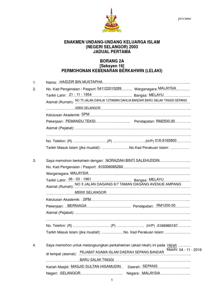 Biasanya borang saksi sudah disediakan dalam borang online nikah. Sebab borang ni tak boleh print selagi tak isi lengkap. Page ni adalah one stop untuk nikah n cerai c dan rujuk r. A borang 2a ini hanya untuk pemohon yang beralamat mykad atau bermastautin di negeri selangor sahaja.