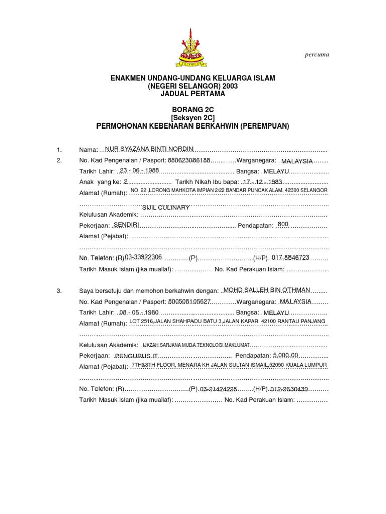 Borang 2c permohonan kebenaran berkahwin perempuan. Wali jika pemohon perempuan. Scribd adalah situs bacaan dan penerbitan sosial terbesar di dunia. Sedia maklum permohonan kebenaran berkahwin online pada masa ini hanya meliputi permohonan yang dibuat di negeri negeri sembilan melaka perlis kedah perak dan wilayah persekutuan. Rujuk senarai semak setelah mendapat tandatangan dan cop ppn bawa borang.