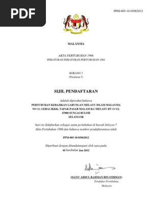 Borang 3 akta pertubuhan 1966. Salinan dokumen sokongan terkini yang diperakui sah. Pertubuhan bermaksud badan yang ditubuhkan untuk menjalankan sesuatu lembaga organisasi atau persatuan dan berdaftar dengan akta pertubuhan 1966. Pe rakuan bombatau su at ngan lesen da i sijil ap dan pem atuh nbangun cf ccc. Orang yang bertanggungjawab ertinya seseorang yang bertanggungjawab bagi pengurusan dan kawalan.