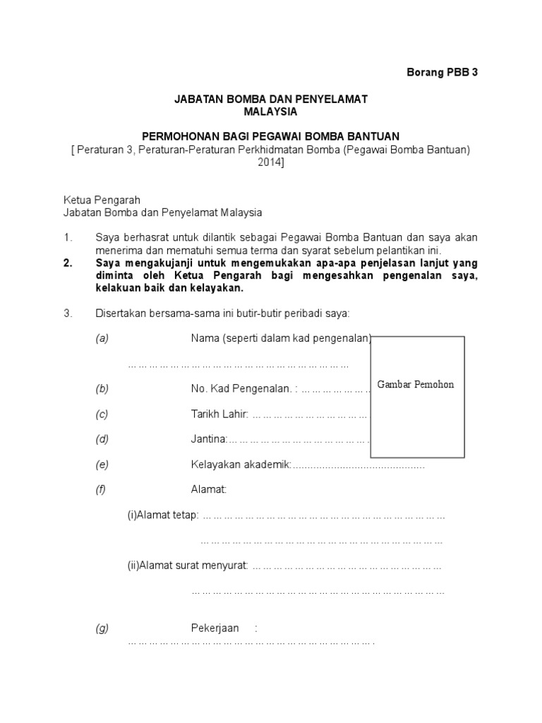 Semua borang permohonan borang pbb 3 hendaklah disertakan dengan lengkap seperti berikut sekeping gambar terbaharu berukuran pasport. Pengiraan beban pendudukan dan muatan pintu keluar mengikut ukbs 1984. Borang tuntutan elaun perjalanan. Jabatan bomba dan penyelamat malaysia permohonan bagi pegawai bomba bantuan peraturan 3 peraturan peraturan perkhidmatan bomba pegawai bomba bantuan 2014 ketua pengarah jabatan bomba dan penyelamat malaysia 1.