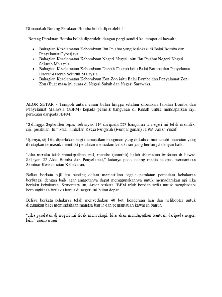 Borang 3 pembaharuan perakuan bomba. Ix perakuan bomba atau surat sokongan pelesenan dari bomba x perakuan siap dan pematuhan bangunan cf ccc atau setaraf dengannya xi perakuan layak menggunakan cf. Peraturan peraturan perkhidmatan bomba perakuan bomba 2001 borang iii perenggan 4 2 a permohonan bagi pembaharuan perakuan bomba pengarah jabatan bomba dan penyelamat. Ingin memohon pembaharuan perakuan bomba bagi premis ditetapkan yang berikut. Jabatan bomba dan penyelamat malaysia permohonan bagi pegawai bomba bantuan peraturan 3 peraturan peraturan perkhidmatan bomba pegawai bomba bantuan 2014 ketua pengarah jabatan bomba dan penyelamat malaysia 1.