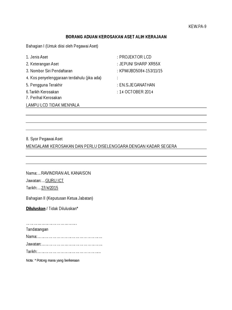 Nombor siri pendaftaran. Kos penyelenggaraan terdahulu jika ada. Nombor siri pendaftaran. Kew pa 9 borang aduan kerosakan aset alih kerajaan bahagian i untuk diisi oleh pegawai aset 1.