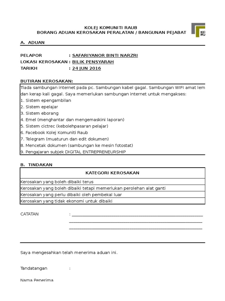 Microsoft word borang aduan kerosakan peralatan 2010 doc author. Kesilapan anda mengisi borang boleh menyebabkan aduan tidak diterima. Item bertanda wajib diisi. Contoh borang aduan kerosakan aset alih kerajaan.