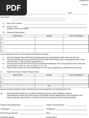J a n m cawangan terengganu other titles borang ak 52. Pemakluman mengenai perubahan borang kuasa tetap ak52 bagi urusan kumpulan wang sekolah bersama sama ini disertakan surat rujukan jpnj akn 400 1 2 3 bertarikh 4 september 2019 untuk tindakan dan makluman tuan. Sekiranya terdapat pertukaran pegawai yang bertanggungjawab mengesah dan menunaikan cek eft pihak sekolah perlu menggunakan borang kuasa tetap ak52 yang. Cek bernilai rmio ooo dan ke atas ii.