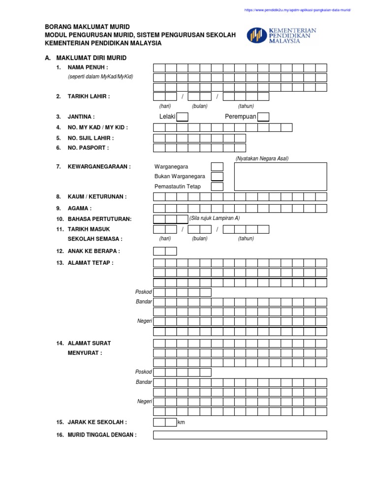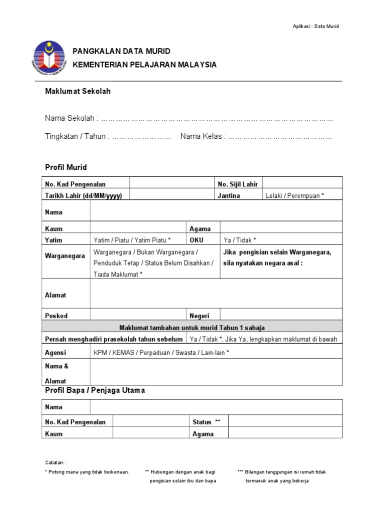 Berikut merupakan borang maklumat murid yang telah dihasilkan berdasarkan aplikasi pangkalan data murid. Data murid warganegara bukan warganegara jika pengisian selainwarganegara penduduk tetap status belum disahkan warganegara sila nyatakan negara tiada maklumat asal no. Aplikasi ini disediakan oleh kpm nkra bagi memudahkan guru guru di setiap sekolah untuk merekod dengan mudah. Namun sekiranya sekolah memerlukan maklumat tambahan maka perlu lampirkan helaian lain.