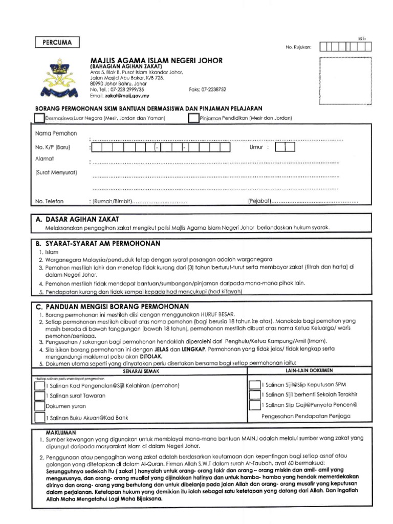 Permohonan mestilah menggunakan borang permohonan sepertimana di lampiran a. Permohonan bantuan zakat selangor bantuan khas covid 19. Permohonan hendaklah menggunakan borang permohonan bantuan zakat asal majlis agama islam negeri johor yang boleh didapati di ibu pejabat majlis agama islam negeri johor tingkat 5 blok b pusat islam iskandar johor johor bahru atau pejabat pejabat agama daerah berhampiran. Majlis agama islam negeri johor aras 5 blok b pusat islam iskandar johor jalan masjid abu bakar 80990 johor bahru johor darul takzim.