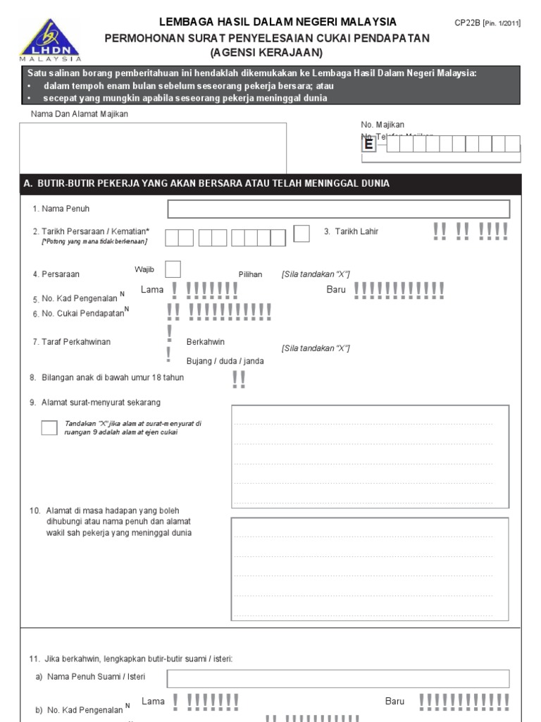 Dalam tempoh enam bulan sebelum seseorang pekerja bersara. Kakitangan perlu menghantar borang permohonan surat penyelesaian cukai pendapatan agensi kerajaan cp22b pin. Permohonan surat penyelesaian cukai pendapatan. 1 2011 ke lembaga hasil dalam negeri lhdn untuk proses pengeluaran surat penyelesaian cukai.