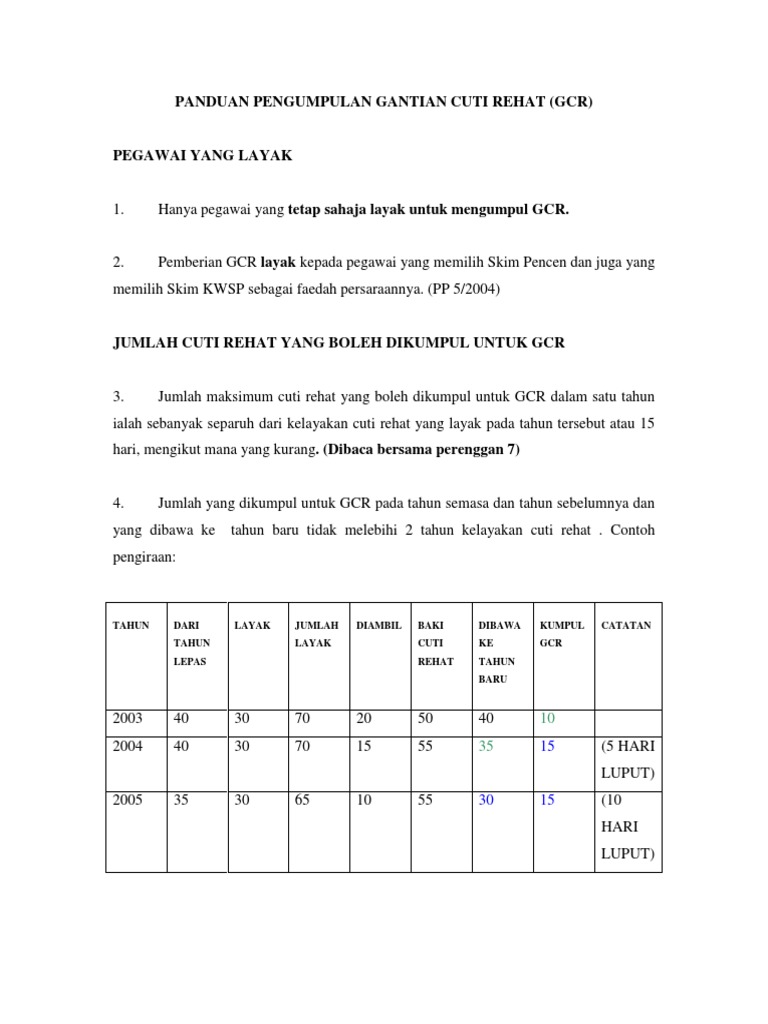 Sebanyak hari adalah dibenarkan dikumpulkan bagi gcr manakala sebanyak hari lagi adalah dibenarkan dibawa ke tahun. Selaras dengan dasar baharu ini pegawai lantikan kontrak layak diberikan kemudahan dan elaun seperti di lampiran c serta apa apa elaun dan kemudahan yang diberikan oleh. 9 tahun 1991 atau sistem saraan malaysia baki cuti rehat. Belanjawan 2020 bagi perkhidmatan awam telah memperuntukkan penebusan awal gcr sebanyak 75 hari untuk ganjaran wang tunai bagi penjawat awam yang telah berkhidmat sekurang kurangnya 15 tahun.