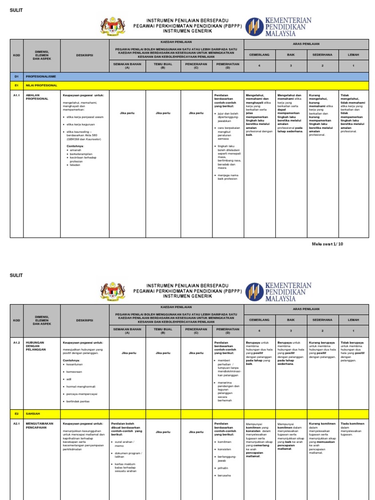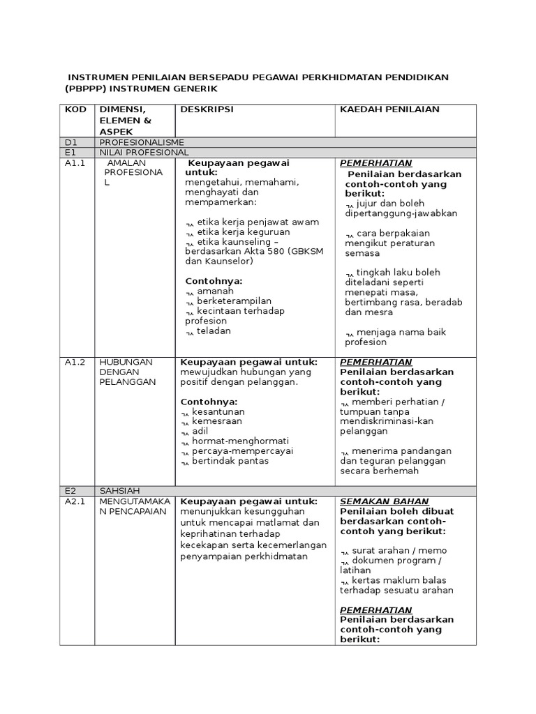 Borang markah pbppp 23 lampiran b. Pegawai perkhidmatan pendidikan pbppp instrumen generik i1generik kod dimensi elemen dan aspek deskripsi kaedah penilaian pegawai penilai boleh menggunakan satu atau lebih daripada satu kaedah penilaian berdasarkan kesesuaian untuk meningkatkan kesahan dan kebolehpercayaan penilaian aras penilaian cemerlang baik sederhana lemah. Penilaian bersepadu pegawai perkhidmatan pendidikan pbppp mula dilaksanakan pada tahun 2015 sebagai tahun percubaan. Pegawai perkhidmatan pendidikan pbppp instrumen fungsional pensyarah 1 i 6pra2015 kod dimensi elemen dan aspek deskripsi kaedah penilaian pegawai penilai boleh menggunakan satu atau lebih daripada satu kaedah penilaian berdasarkan kesesuaian untuk meningkatkan kesahan dan kebolehpercayaan penilaian aras penilaian.