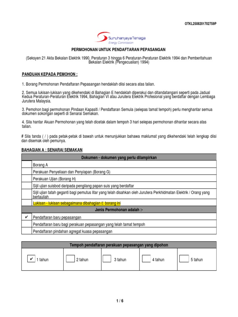 Suruhanjaya tenaga boleh melakukan pemeriksaan dan ujian pepasangan setelah menerima borang a yang di hantar bersama sama permohonan oleh pemohon. 4 7 2009 2 06 43 pm. Berkuasa bekalan hendaklah mulai dari ini membekalkan tenaga seperti yang diminta oleh pemunya atau pengurusan pepasangan. Saya nampak fenomena ini menampakkan kesedaran daripada warga malaysia terhadap kepatuhan kepada undang undang dan peraturan yang mana ia digubal tidak lain dan tidak bukan.