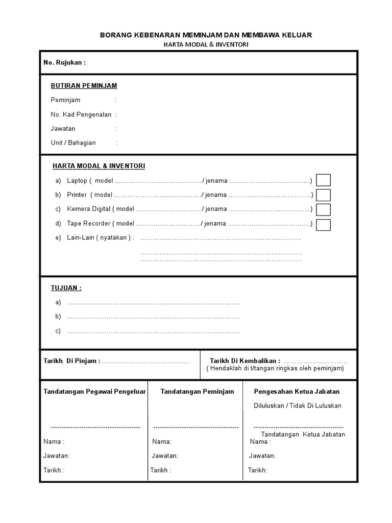 Borang harta modal. Tatacara pengurusan harta modal 1. Nyatakan lokasi harta modal mengikut rekod dan lokasi harta modal semasa pemeriksaan. Keadaan harta modal. Borang laporan penerimaan aset alih kerajaan universiti.