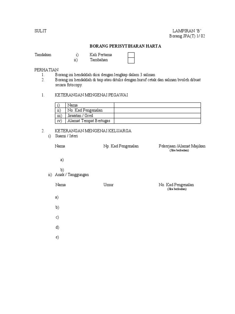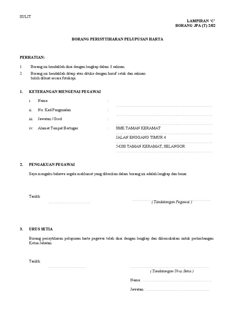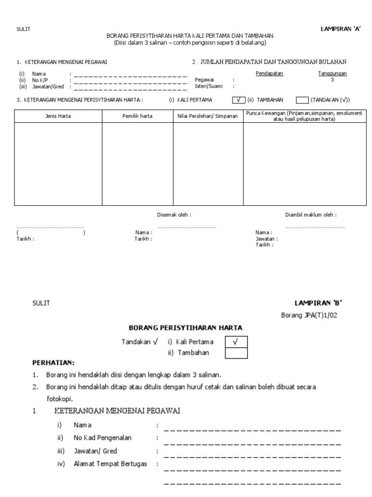 Borang jpa t 2 02 borang perisytiharan pelupusan harta perhatian. Borang ini hendaklah diisi dengan lengkap dalam 3 salinan. Sila tandakan pada ruang berkenaan amaklumat pesara gemulah1a. Sulit lampiran b borang jpa t 1 02 borang perisytiharan harta tandakan i kali pertama ii tambahan perhatian.