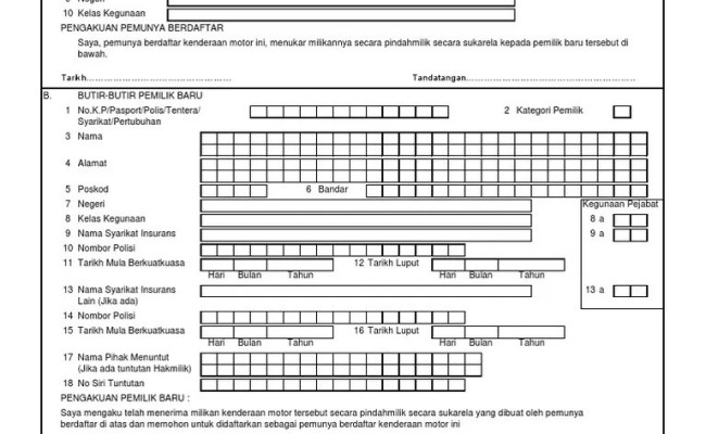 26 jalan tun hussien presint 4 pusat pentadbiran kerajaan persekutuan 62100 wp putrajaya. Borang penyata pertukaran milikan kenderaan motor selain daripada pindahmilik secara sukarela oleh pemunya berdaftar jpj k3a sebelum info korporat pada 1 april 1946 jabatan pengangkutan jalan telah ditubuhkan yang bertujuan menyelaras segala aspek berkaitan pengangkutan bagi seluruh negeri. Borang permohonan pelekat kenderaan oku jpj k17 borang permohonan pembatalan pendaftaran kenderaan jpj k1c. Jpj k3 is known as borang penyata pertukaran milikan kenderaan motor secara sukarela oleh pemunya berdaftar.