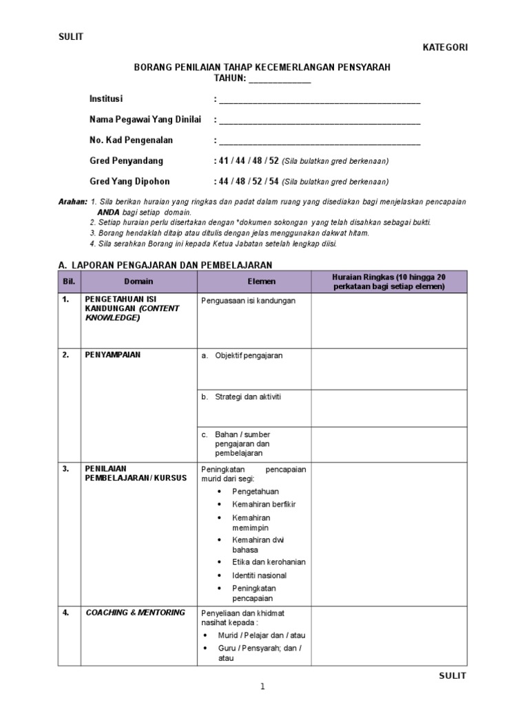 Use the download button below or simple online reader. 29 41 sila bulatkan gred berkenaan mata pelajaran diajar. Borang penilaian tahap kecemerlangan guru borang kategori 1b guru. Sulit 4 sulit kategori 3 contoh.