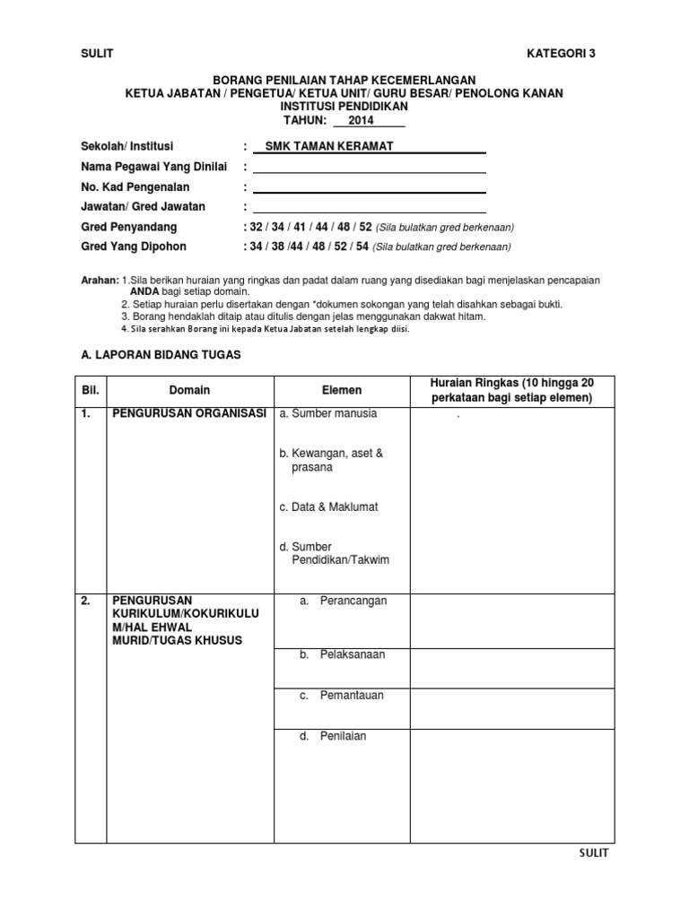 Use the download button below or simple online reader. Skop penilaian item penilaian huraian ringkas 10 hingga 20 perkataan bagi setiap item penilaian 1. Sulit kategori 3 sulit 1 borang penilaian tahap kecemerlangan ketua jabatan pengetua ketua unit guru besar penolong kanan institusi pendidikan tahun. Borang 3b kategori iii mengurus 3 c.