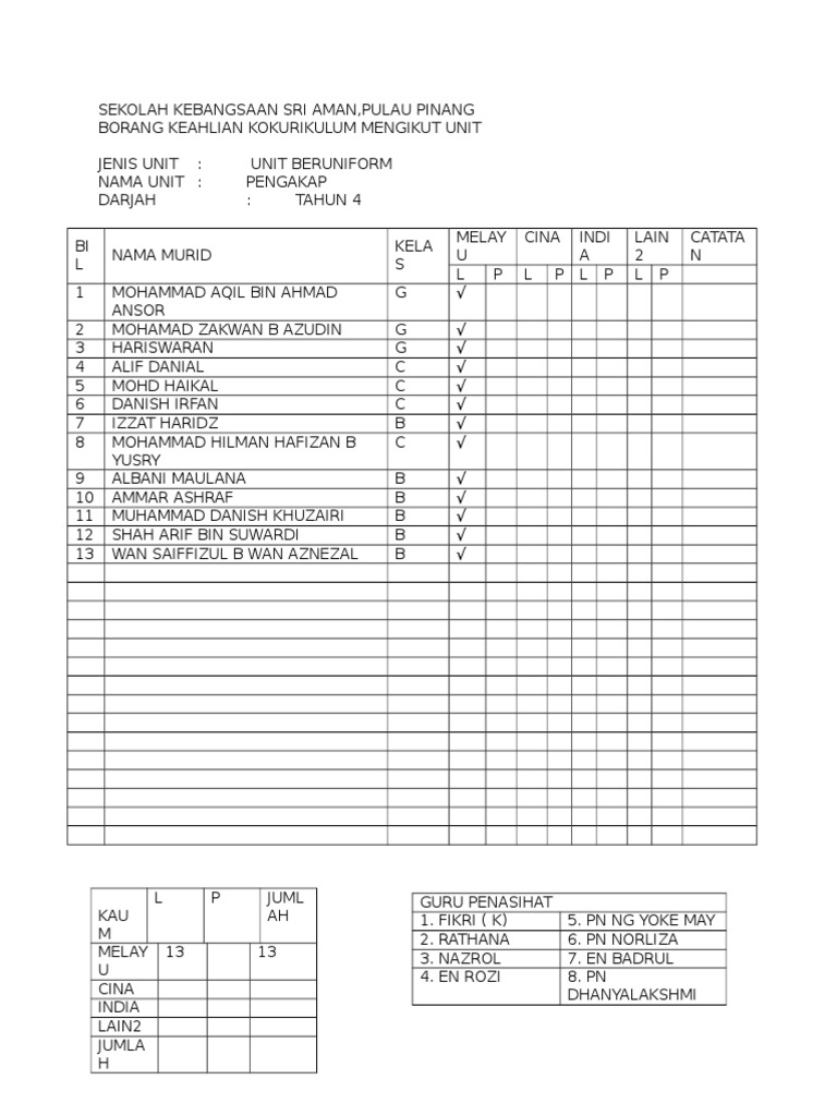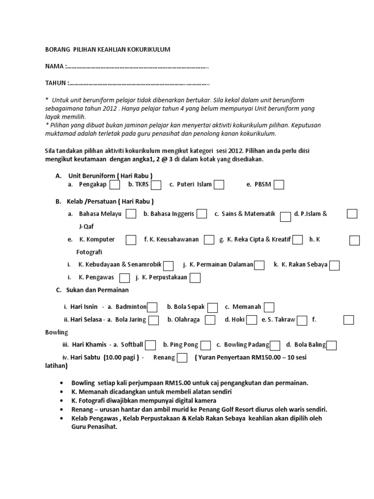 Borang keahlian kokurikulum. Borang data peruntukan kokurikulum diisi oleh jpn 2. Borang pendaftaran murid r01 borang pendaftaran pasukan r02 borang penilaian aktiviti kokurikulum borang laporan perjumpaan mingguan borang semakan keahlian kokurikulum tahun 4 2012. Buku rekod kehadiran kokurikulum. Borang data kehadiran aktiviti kokurikulum.