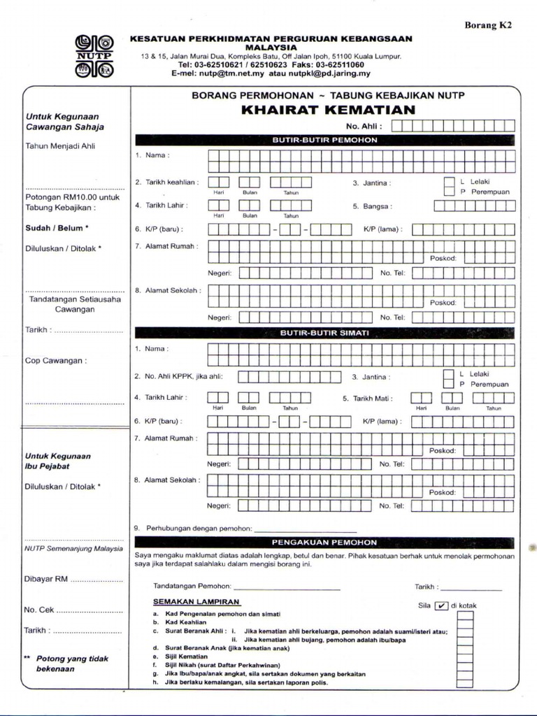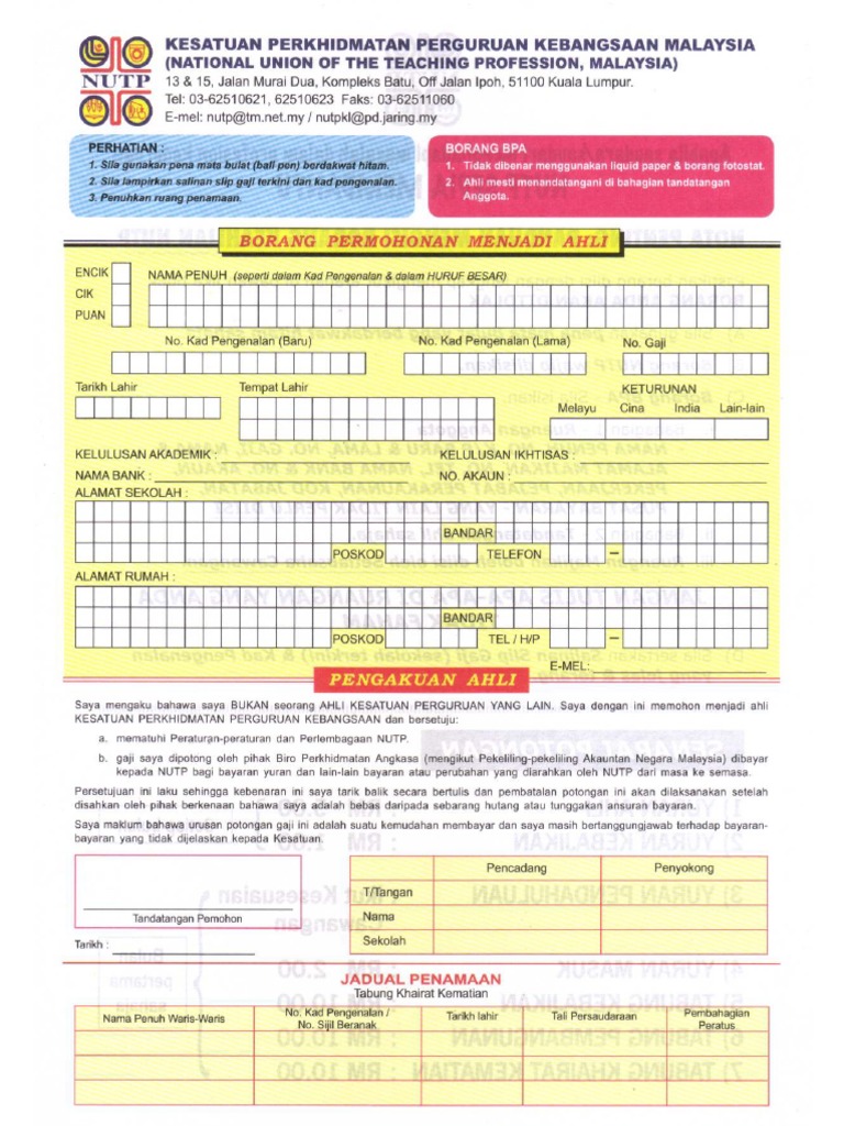 Borang keahlian nutp. Hantarkan borang siap diisi ke cawangan kppk yang terdekat. Anda juga boleh mendapatkan borang pendaftaran ahli dari ibu pejabat kppk atau cawangan di seluruh negara. Hantarkan borang siap diisi ke cawangan kppk yang terdekat. Keunikan kppk keahlian kppk terdiri daripada pelbagai kategori guru guru dari semua jenis peringkat sekolah.