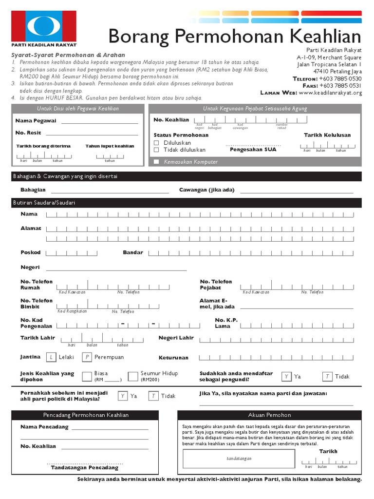 Syarat syarat permohonan arahan permohonan keanggotaan dibuka hanya kepada warganegara malaysia yang berumur 18 tahun ke atas. Sila rujuk peraturan tetap ranting seperti yang dikepilkan bersama borang ini. Borang permohonan keahlian parti keadilan rakyat a 1 09 merchant square jalan tropicana selatan 1 47410 petaling jaya telefon. Ibu pejabat parti keadilan rakyat a 1 09 merchant square jalan tropicana selatan 1 47410 petaling jaya selangor malaysia.