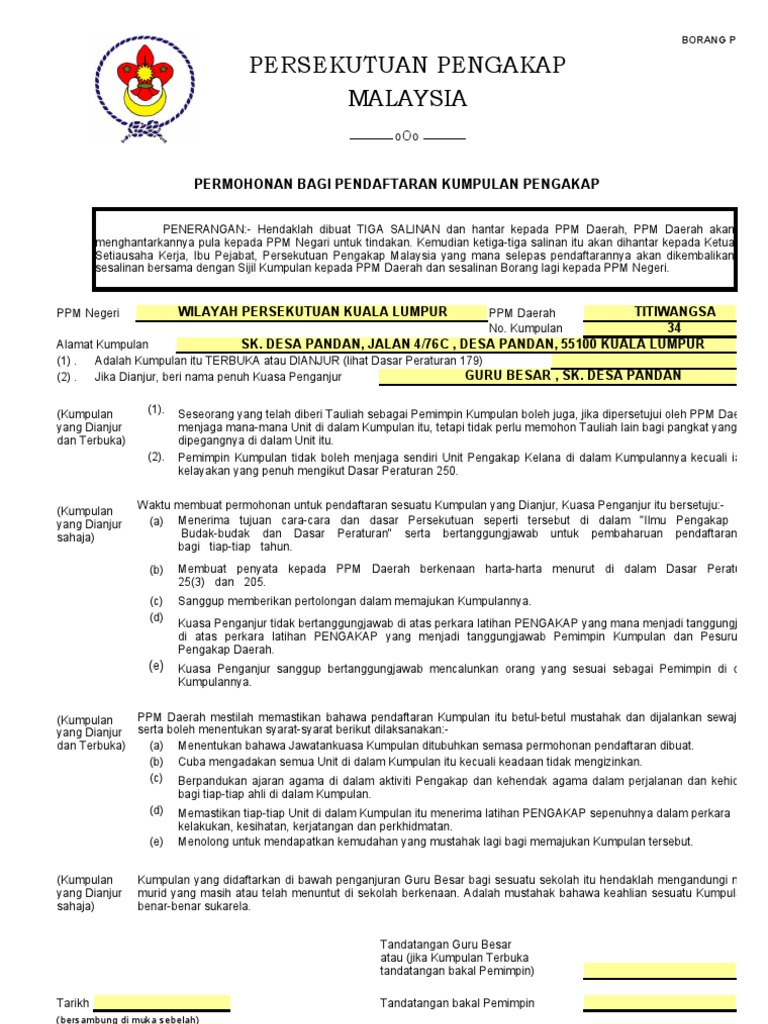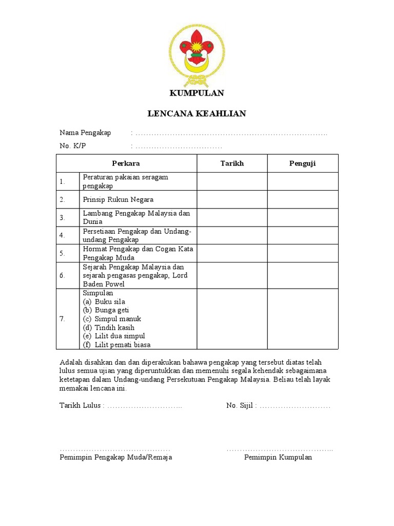 Pengakap kelana keahlian oleh ahli pengakap yang berumur antara 17 hingga 26 tahun. Borang keahlian daerah negeri ppm 1e borang pendaftaran ahli untuk daerah negeri powered by phoca download. Assalammualaikum salam sejahtera dan salam pengakap. Sijil pengakap raja ditandatangani oleh dymm yang di pertuan agong serta semua sultan di malaysia.