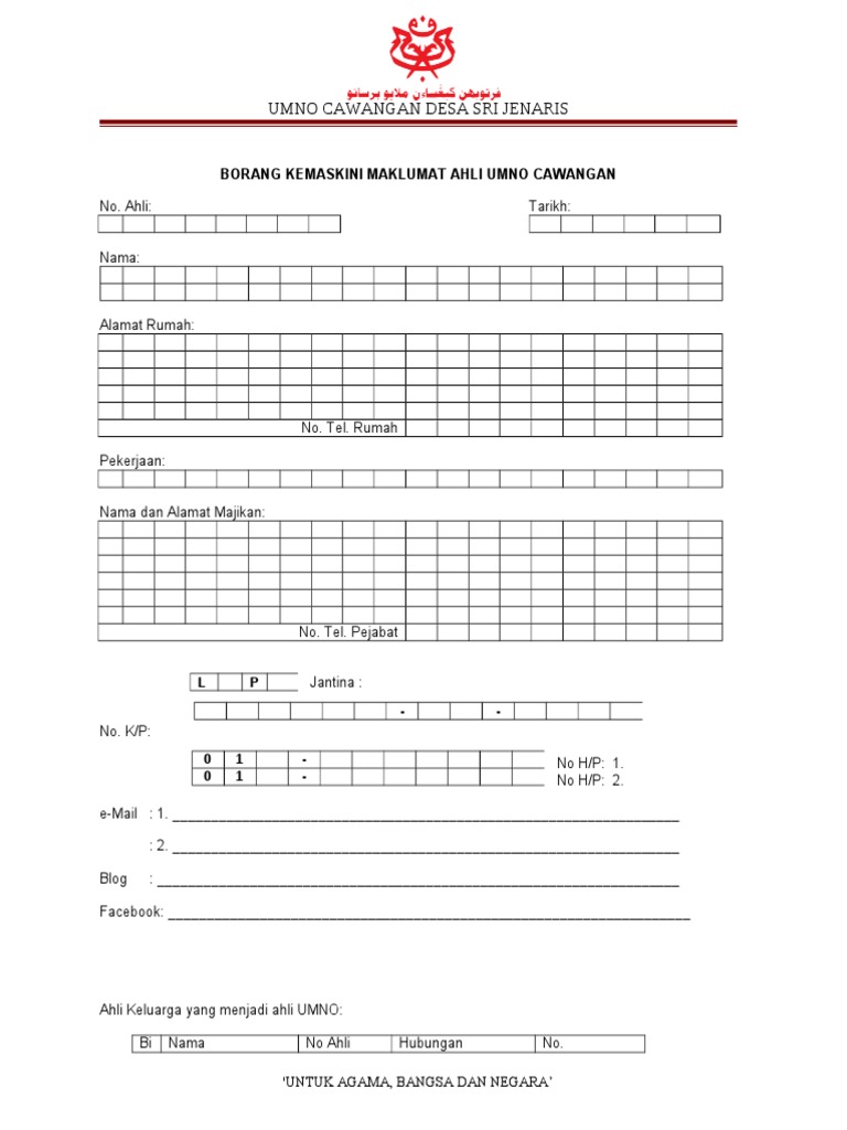 Perkukuhkan barisan perkasa muafakat zahid. Serah borang keahlian umno 9 march 2019 berita bergambar jasin 9 mac timbalan presiden yang menjalankan tugas presiden umno datuk seri mohamad hasan hadir pada majlis perjumpaan bersama umno bahagian jasin di homestay kem modal insan parit penghulu sungai rambai di sini pagi ini. 8 30am 5 30pm isnin jumaat ibu pejabat umno 03 4042 9511 faks pejabat sua 03 4041 6955 faks pejabat suk 03 4041 2358 faks penerangan 03 4045 6433 faks pentadbiran 03 4044 4522 faks. Borang keahlian online kelab umno western australia kuwa sila isi maklumat maklumat yang diperlukan dengan lengkap.