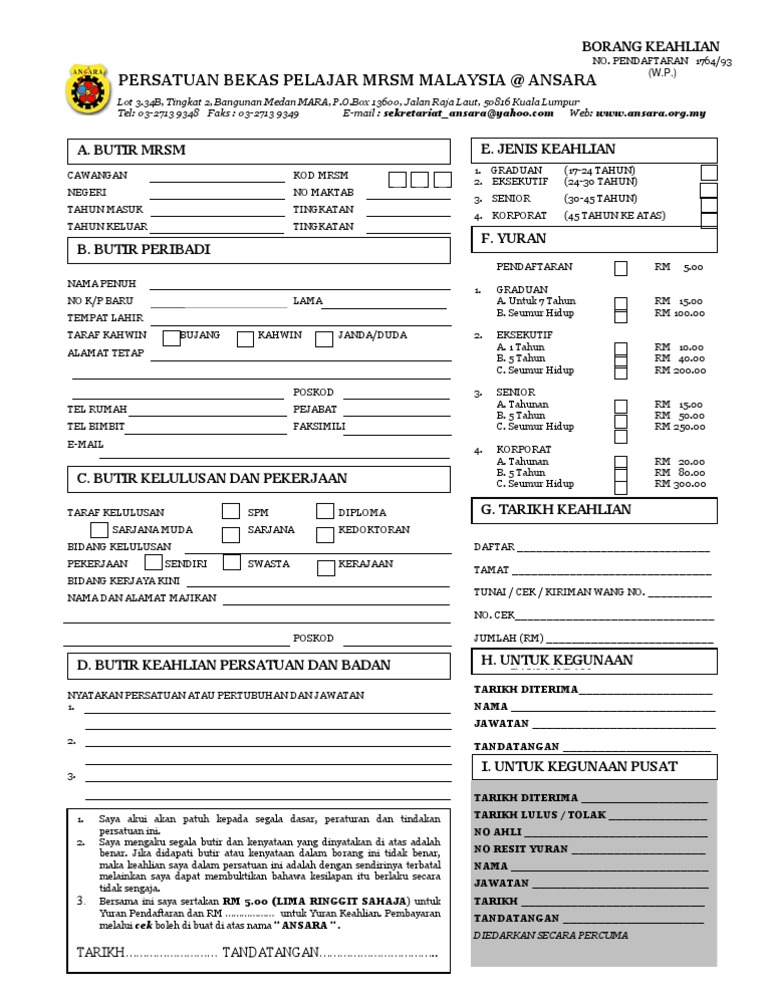 Borang permohonan keahlian baharu. 03 4105 8679 7866. Saya juga akan mematuhi semua peraturan yang ditetapkan dari semasa ke semasa selagi peraturan peraturan itu tidak bercanggah dengan undang undang dan peraturan sekolah kementerian pelajaran malaysia dan negara. Borang keahlian tuntutan ahli seumur hidup tuntutan ahli skim 16.