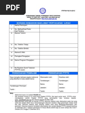 Borang kemaskini maklumat pertukaran pinjaman ujrah. Sebarang maklumat lanjut berkaitan ptptn boleh terus ke mana mana cawangan ptptn terdekat atau rujuk informasi dibawah. Borang permohonan penggabungan pinjaman. Anda dinasihatkan supaya membuat kemaskini dengan segera jika ingin memohon untuk penangguhan bayaran ptptn.