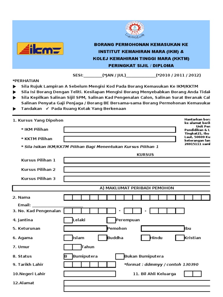 Maklumat terkini permohonan kemasukan dan semakan keputusan ke kolej profesional mara sesi ambilan tahun 2020 untuk program diploma dan sijil. Borang permohonan online ikm kktm mjii 2020. Salah satu pusat pengajian di bawah kelolaan majlis amanah rakyat mara ialah institut kemahiran mara ikm. Permohonan kolej profesional mara 2020 online kpm.
