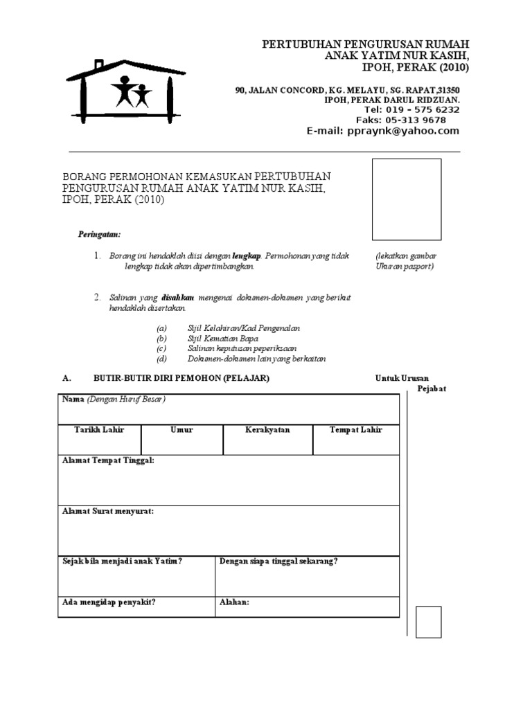 Borang kemasukan rumah anak yatim. Km 11 jalan hulu kelang 68000 ampang selangor darul ehsan. Isi borang kemasukan dan sertakan sekali salinan surat kematian bapa sijil beranak buku laporan sekolah dan kad kesihatan dari sekolah. Permohonan yang tidak lengkap tidak akan dipertimbangkan 2. Pertubuhan pendidikan anak anak yatim selangor.
