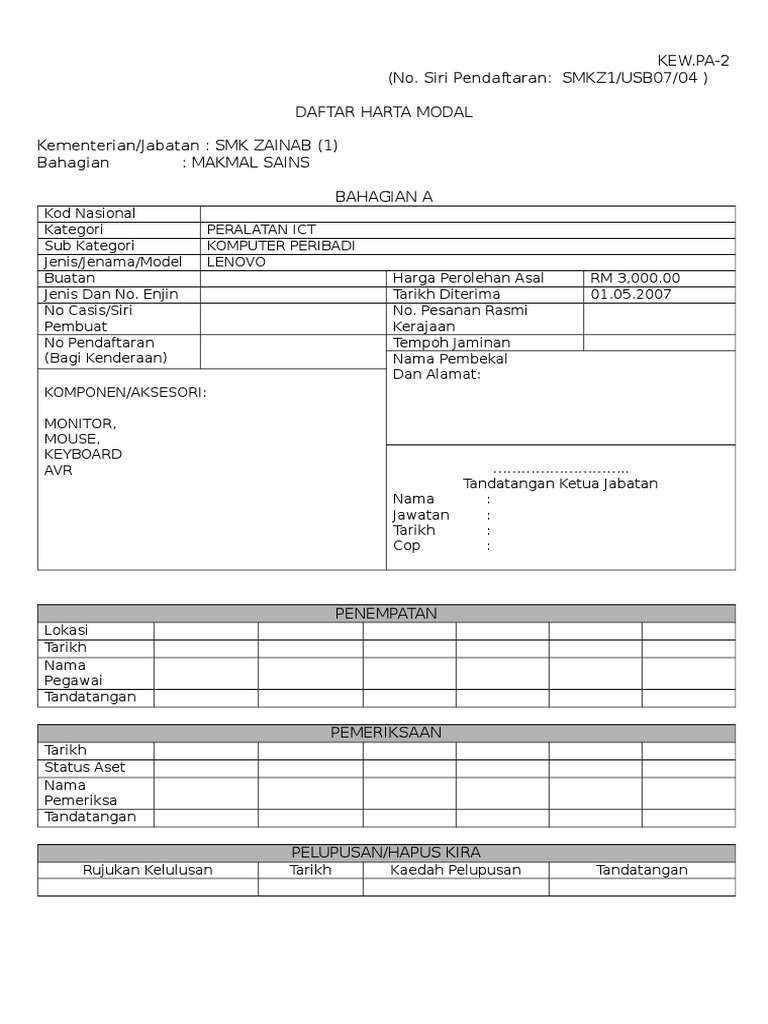 Jumlah nilai harta modal rm jumlah. Version last modified by. Kos penyelenggaraan terdahulu jika ada. Tawaran boleh dibuat dengan menggunakan borang tender pelupusan aset kew pa 22 yang boleh diperolehi di alamat seperti di para 5.
