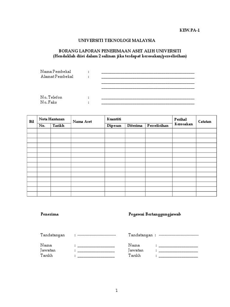 Borang kew pa 2 utm. 6 03 9051 3447 fax 6 03 9051 4457 jabatan bendahari universiti pertahanan nasional malaysia kem perdana sungai besi 57000 kuala lumpur bursar upnm edu my. Peralatan komputer perabot dan lain lain 1 1 mengisi borang permohonan perakuan pelupusan kew pa 17 yang lengkap. Universiti teknologi malaysia daftar harta tetap fakulti ptj unit makmal. Bagi perolehan inventori item yang bernilai bawah rm3 000 sertakan borang kew pa 3.