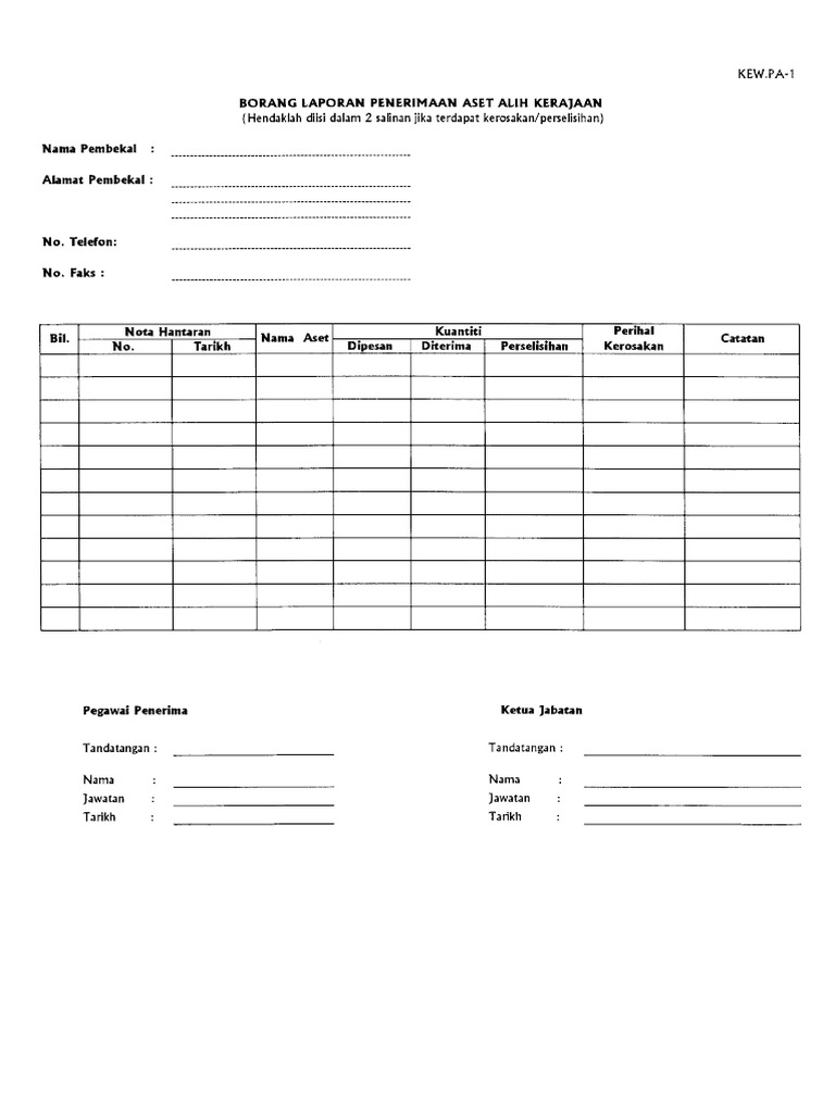 Borang kewpa 2. Kew pa 9 borang aduan kerosakan aset alih kerajaan bahagian i untuk diisi oleh pegawai aset 1. Jika lebih daripada 2 orang ahli lembaga pemeriksa ruangan boleh ditambah tarikh pembelian tempoh digunakan simpanan rm rm kew pa 17 laporan lembaga pemeriksa aset alih kerajaan bil jabatan bahagian keterangan aset unit kuantiti harga perolehan asal nilai semasa nyatakan keadaan aset dengan jelas syor kaedah pelupusan dan justifikasi. Nombor siri pendaftaran. Potong mana yang berkenaan kew pa 10 borang aduan kerosakan aset alih bahagian i untuk diisi oleh pengadu.