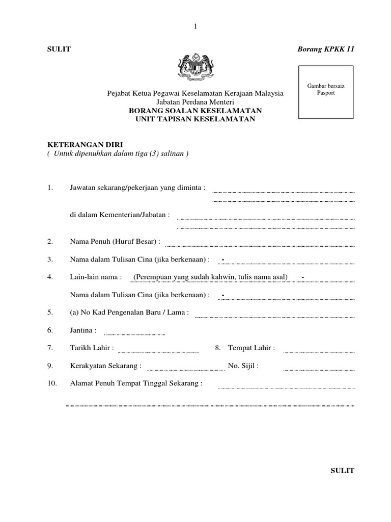 Perubahan butiran peribadi atau perlantikan baru hendaklah dimaklumkan ke pejabat ketua. Jika ruangan tidak mencukupi kepilkan dengan lampiran lain. Sediakan gambar original berukuran passport. Sulit borang kpkk 11 sulit pejabat ketua pegawai keselamatan kerajaan malaysia borang kpkk 11 jabatan perdana menteri borang tapisan keselamatan kasar keterangan diri pemohon isi dalam dua 2 salinan serta guna huruf besar dan dakwat hitam 1.
