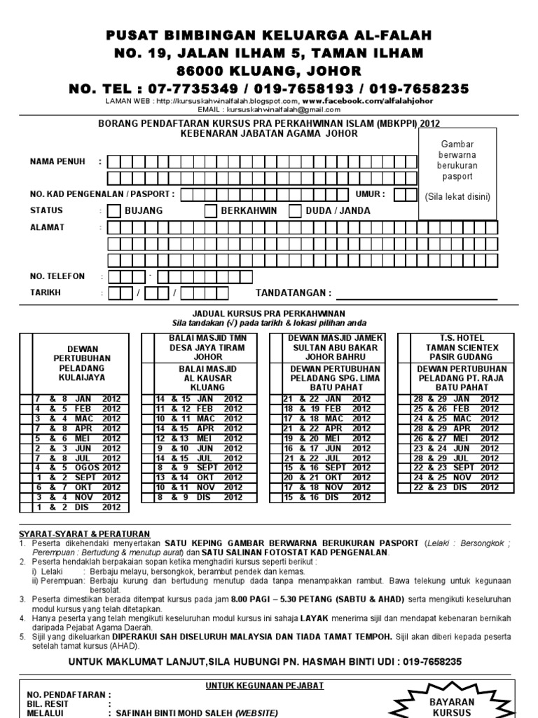 Permohonan tauliah peguam syarie negeri johor. Pusat kursus kami telah diberi kebenaran untuk menganjurkan kursus pra perkahwinan serta telah berdaftar dengan jabatan agama johor dan menggunakan modul bersepadu kursus pra perkahwinan islam negeri johor. 4 kursus bagi perkahwinan kali pertama sahaja. Pusat bimbingan keluarga al falah merupakan pusat kursus kahwin yang berdaftar di bawah jabatan agama islam negeri johor jainj dan antara pusat kursus paling lama beroperasi di johor sejak tahun 1997.