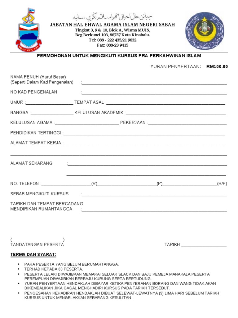 Tingkat 3 9 dan 10 blok a wisma muis beg berkunci 103 88737 kota kinabalu sabah. Borang permohonan akad nikah melalui sidang video. Tingkat 3 9 dan 10 blok a wisma muis beg berkunci 103 88737 kota kinabalu sabah. Borang permohonan salinan sijil kursus pra perkahwinan islam hilang rosak 9.