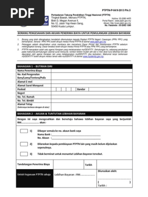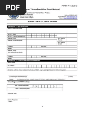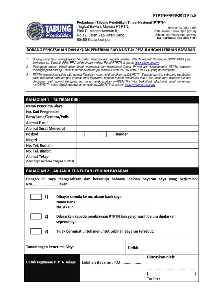 Perbadanan tabung pendidikan tinggi nasional tingkat bawah menara ptptn blok d megan avenue ii no 12 jalan yap kwan seng 50450 kuala lumpur. 9 8 2011 11 25 35 am. Bagi tujuan membuat pindahan deposit sspn i atau lebihan bayaran balik pinjaman ke akaun pendeposit penerima biaya yang sama lain. Bagi tujuan tuntutan lebihan bayaran balik yang tidak melebihi rm3 000 00 yang.