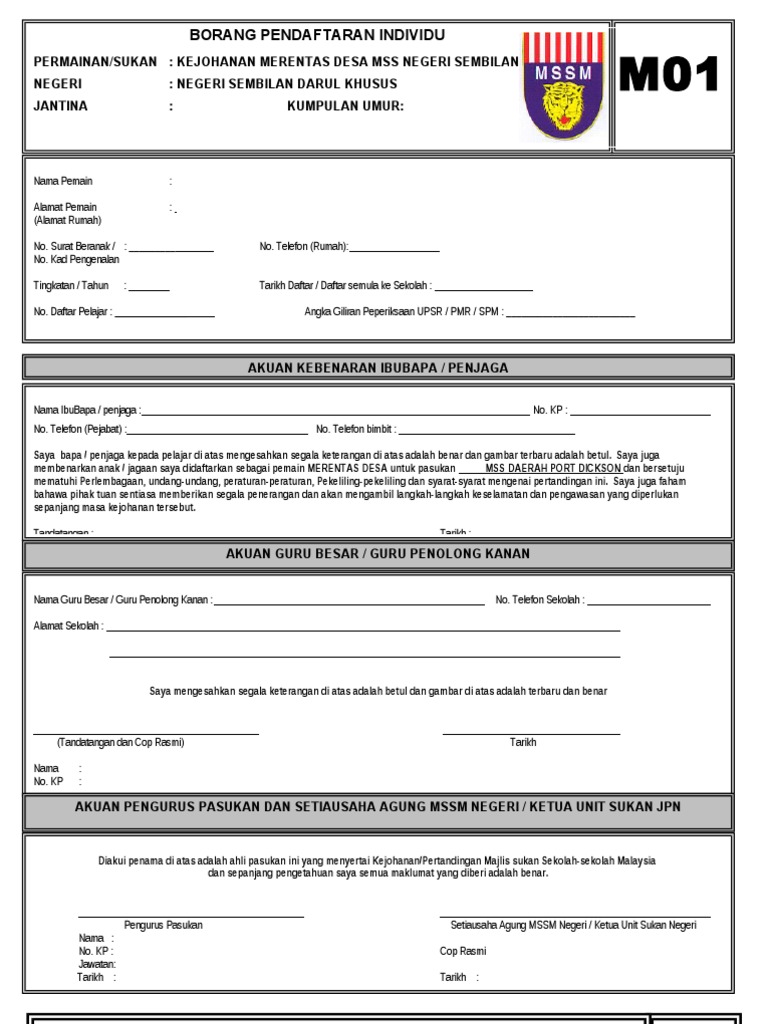 Borang m01 dan m02. Borang pendaftaran pasukan mssm permainan sukan. Borang m01 dan borang m02 borang pendaftaran merentas desa rasmi borang m01 individu. Tarikh daftar daftar semula ke sekolah. Huraian sukatan pelajaran pendidikan kesihatan julai 2009 3 jun 2009 4 tentang saya.