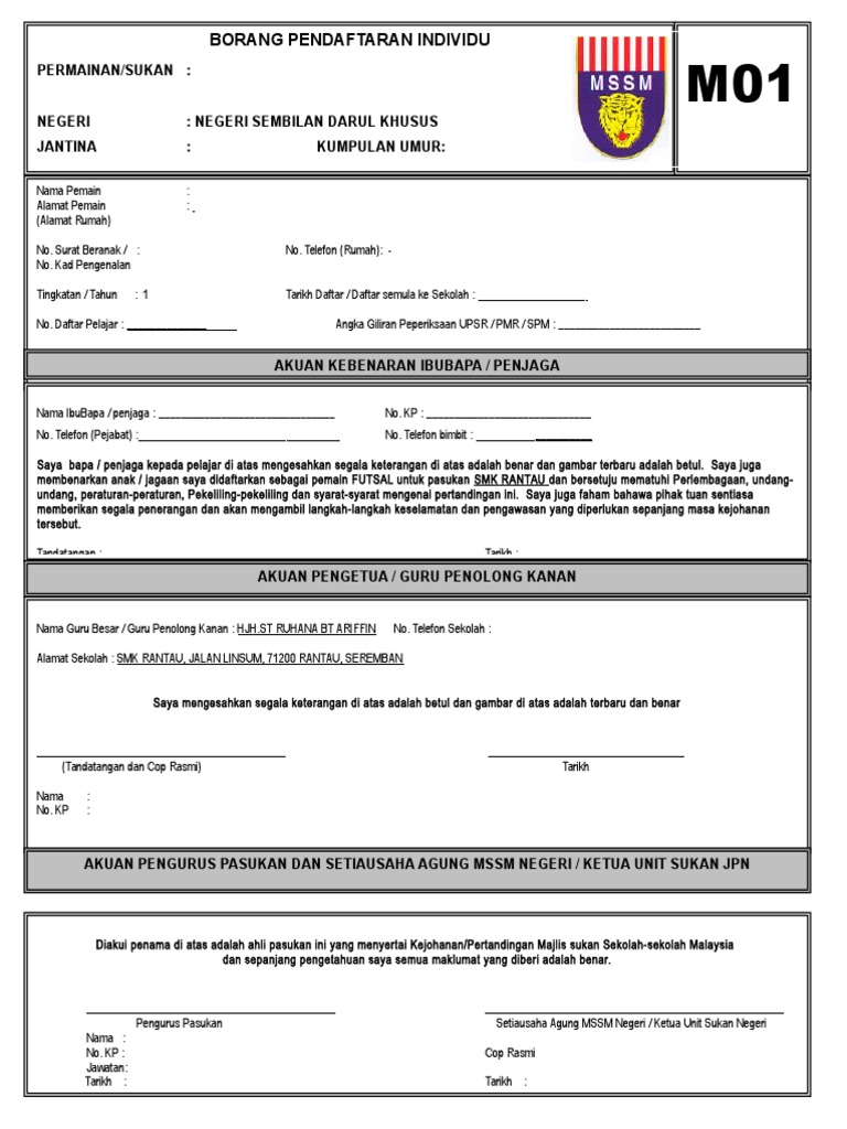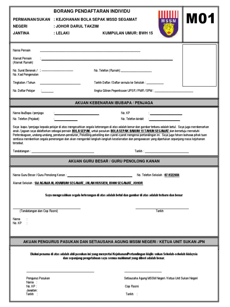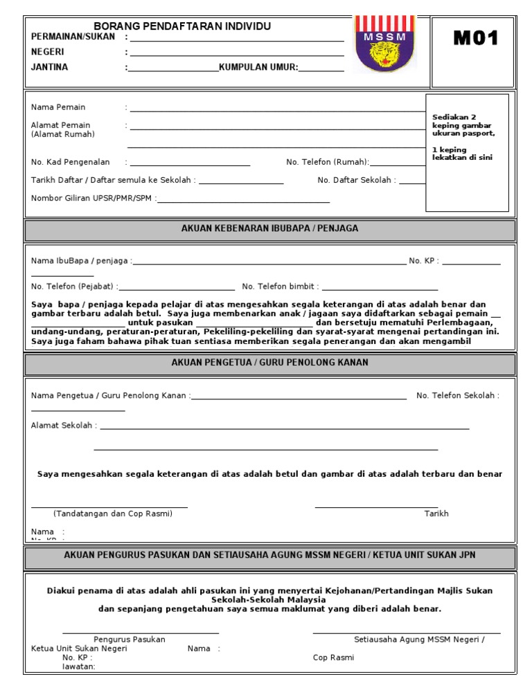 Mssd kota setar kali ke 36 tahun 2018 6 9 mac 2018 stadium darulaman. Borang pendaftaran individu permainan sukan. Saya bapa penjaga kepada pelajar di atas mengesahkan segala keterangan di atas adalah benar dan gambar terbaru adalah betul. Berminat dengan sistem ini sila hubungi 0194165117 saridan untuk urusan pendaftaran peserta sila hubungi admin.