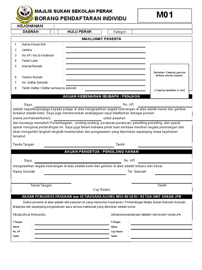 Walaubagaimanapun proses pelantikan dan penempatan adalah tertakluk kepada syarat syarat kelayakan permohonan dan arahan rasmi kpm jpn perak. View notes borang pendaftaran r01 from engineerin kt at open university malaysia. Borang m01 borang m01 the beach is my happy place plank board sign with starfish and rhinestone accents x plank board sign with starfish and rhinestone accents. Selamat datang ke blog rasmi kejohanan bola sepak majlis sukan sekolah perak msspk 2019 manjung perak.