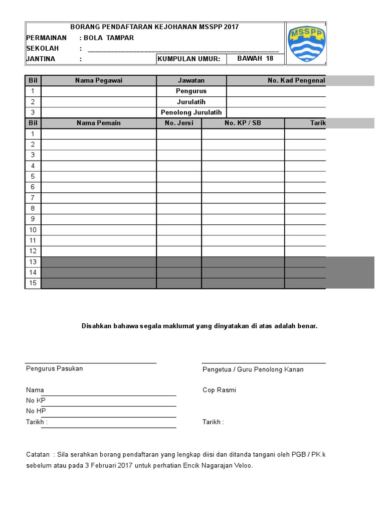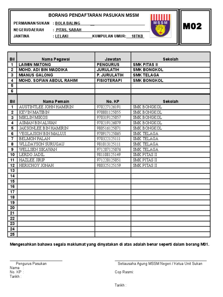 Borang pendaftaran pasukan mssm permainan sukan. M02 bil nama pegawai jawatan sekolah 1 2 3 4 5 6 bil nama pemain no. Saridan abd hamid no tel. Angka giliran peperiksaan awam pmr spm.