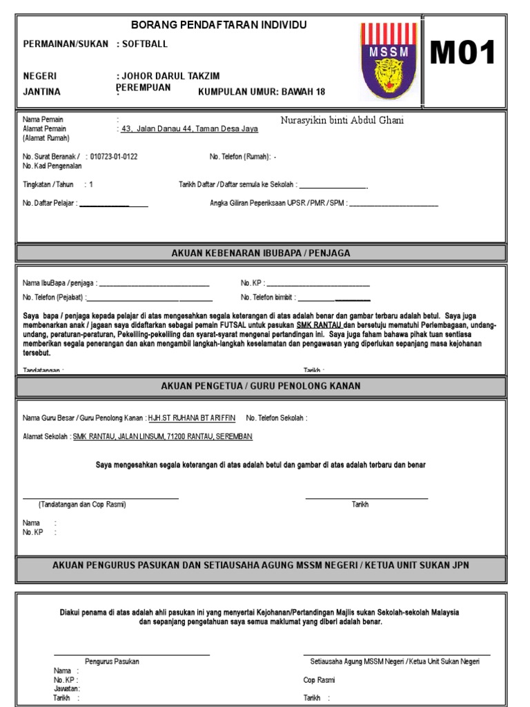 Sukan m01 mssm 2016 sukan surat kebenaran ibubapapenjaga 2016. 3 1 2 salinan borang ro1 diperlukan. Salinan kad pengenalan surat beranak yang disahkan majikan sekolah berkenaan. Dokumen disatukan menggunakan ring dua lubang.