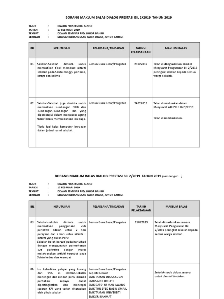 Salinan soft copy maklum balas rumusan dialog prestasi ke email email protected atau telegram ke no 013 7417298 sebelum atau pada 31 oktober 2018 4. Kepada guru besar sk sjkc sjkt daerah tangkak seperti di lampiran untuk makluman dan tindakan pihak pengurusan sekolah. Kepada guru besar sekolah sekolah kurang murid skm daerah tangkak. Borang maklum balas dialog prestasi bil 3 2016.