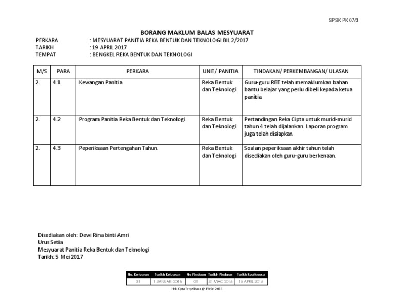 Borang pk 07 5 maklum balas minit mesyuarat kali pertama 2017. Contoh maklum balas minit mesyuarat. Pk 09 pengurusan pusat sumber. Pk 07 pengurusan mesyuarat.