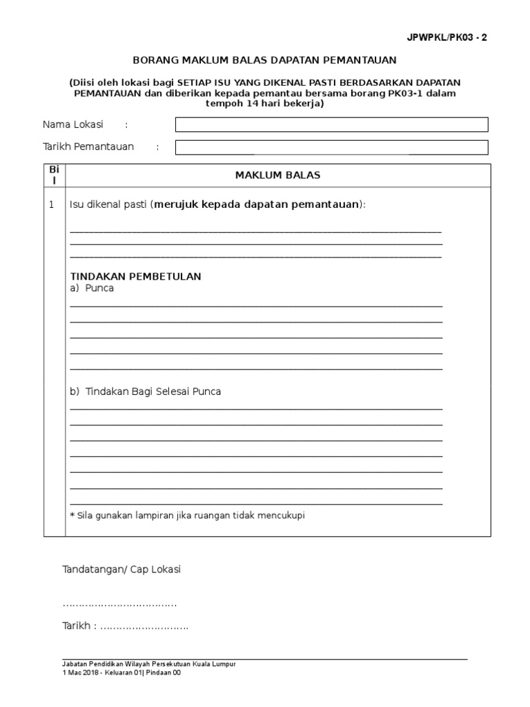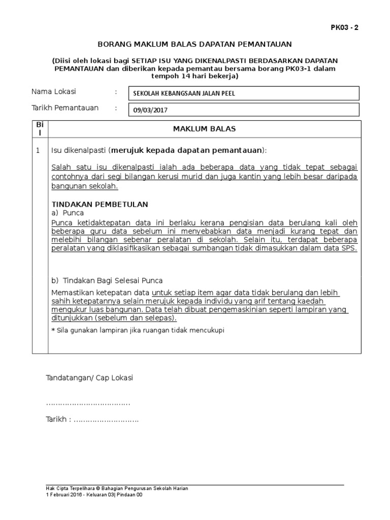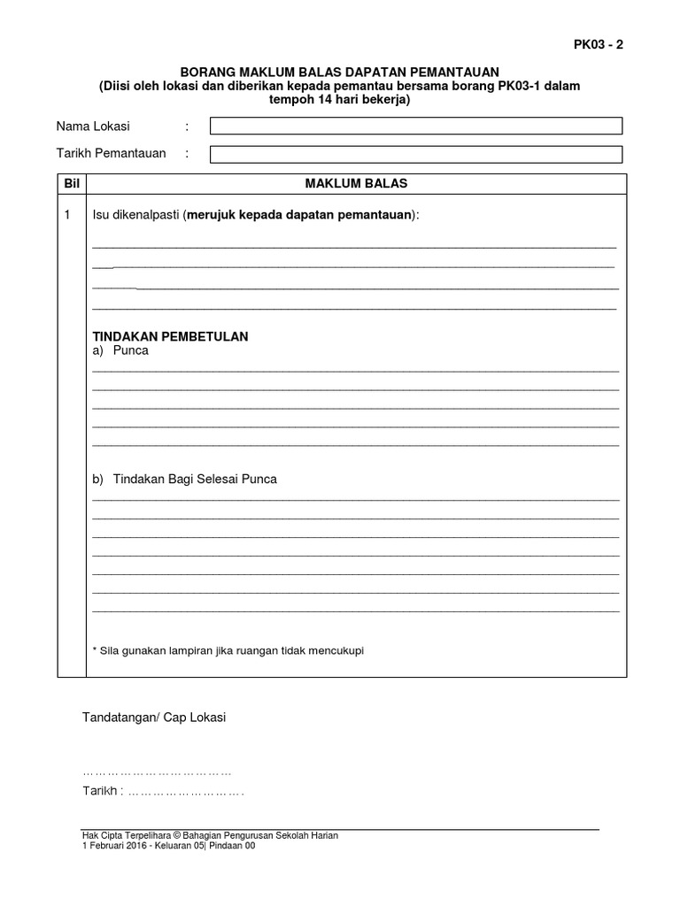 3 berdasarkan maklum balas dari lokasi berhubung perkara 2 1 dan 2 2 diisi oleh pemantau setelah menerima borang ubm p02. Instrumen pemantauan spsk 1 there is document instrumen pemantauan spsk 1 available here for reading and downloading. Pk03 2 borang maklum balas dapatan pemantauan by pvillaorkid. Disediakan oleh lokasi dalam tempoh 14 hari bekerja menggunakan borang ubm p02 rujuk instrumen pemantauan bagi prestasi kerja yang tidak dipenuhi author.