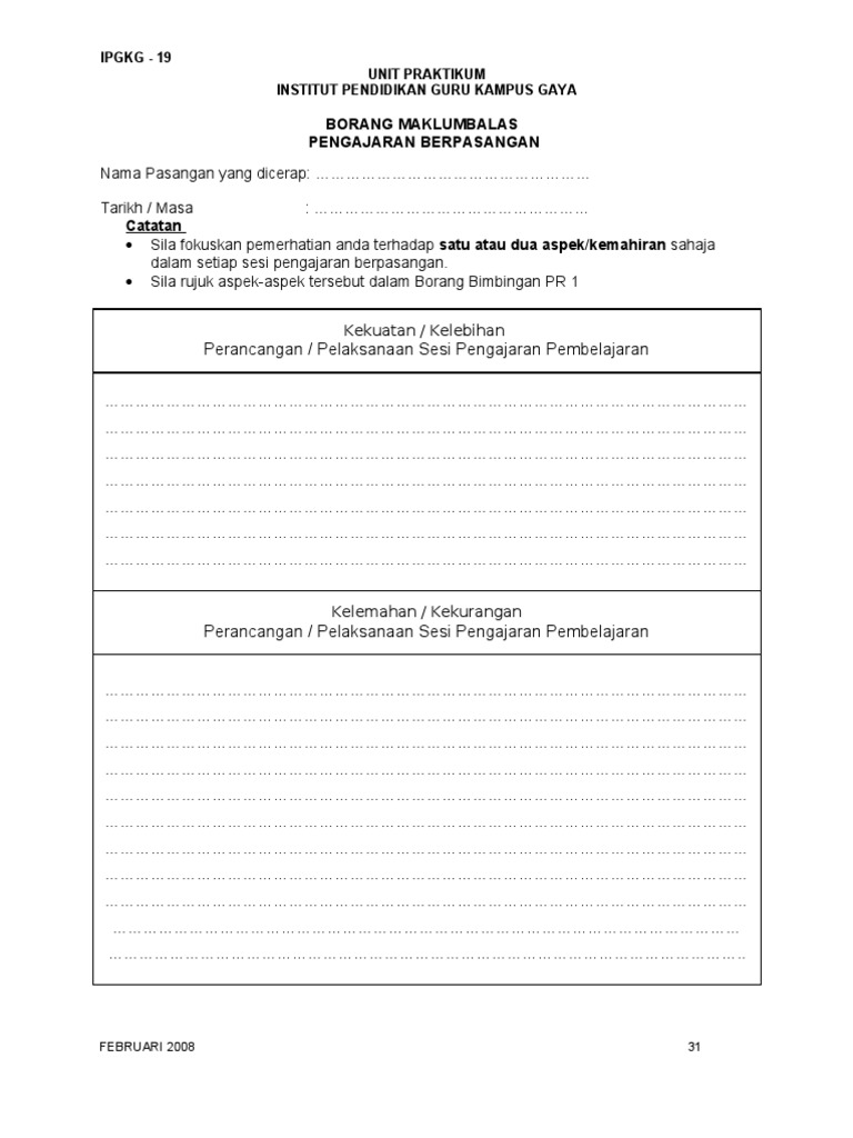 Borang maklum balas pengajaran berpasangan. Memberi peluang kepada guru pelatih membuat pemerhatian pengajaran guru pelatih yang berpengalaman. Walau bagaimanapun bagi memastikan sistem berjalan dengan lancar sesi percubaan telah. 5 3 bahagian ketiga kemudahan fizikal dan peralatan 5 3 1 lengkapkan borang kemudahan yang tredapat di sekolah. Scribd is the world s largest social reading and publishing site.