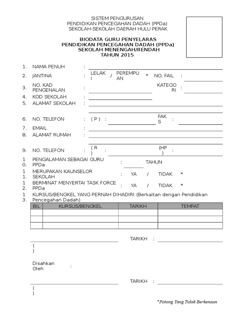 Borang maklumat guru penyelaras ppda. Sehubungan dari itu diminta semua sekolah menengah dan rendah menghantar maklumat guru penyelaras ppda bagi tahun 2012. 9 57 bertarikh 09 januari 2012 adalah berkaitan. Pengisian maklumat guru penyelaras pendidikan pencegahan dadah negeri johor 2012 guru penyelaras. Aszlizam bin tobari di unit hem.