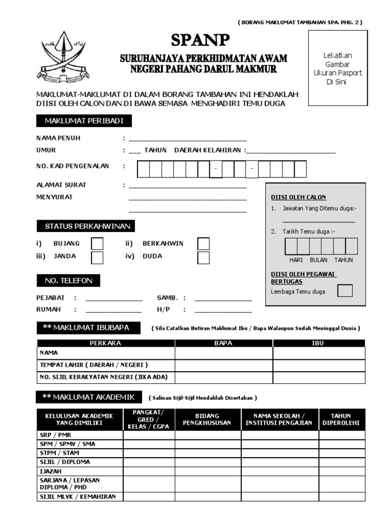 Borang permohonan jawatan di dalam perkhidmatan awam negeri sabah borang spa 1 pindaan 1 98. Borang syor pelantikan menanggung kerja memangku kenaikan pangkat borang 7 spa pindaan 1 94.