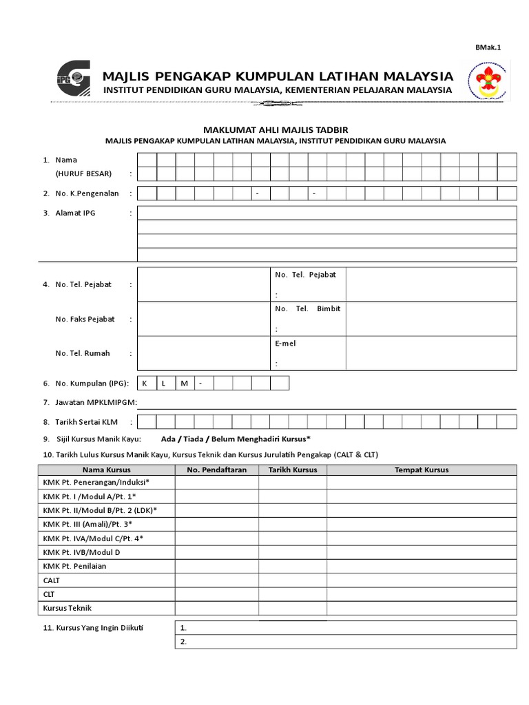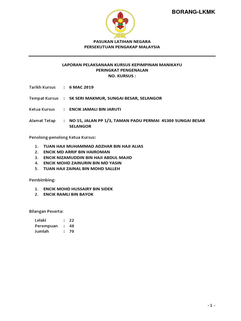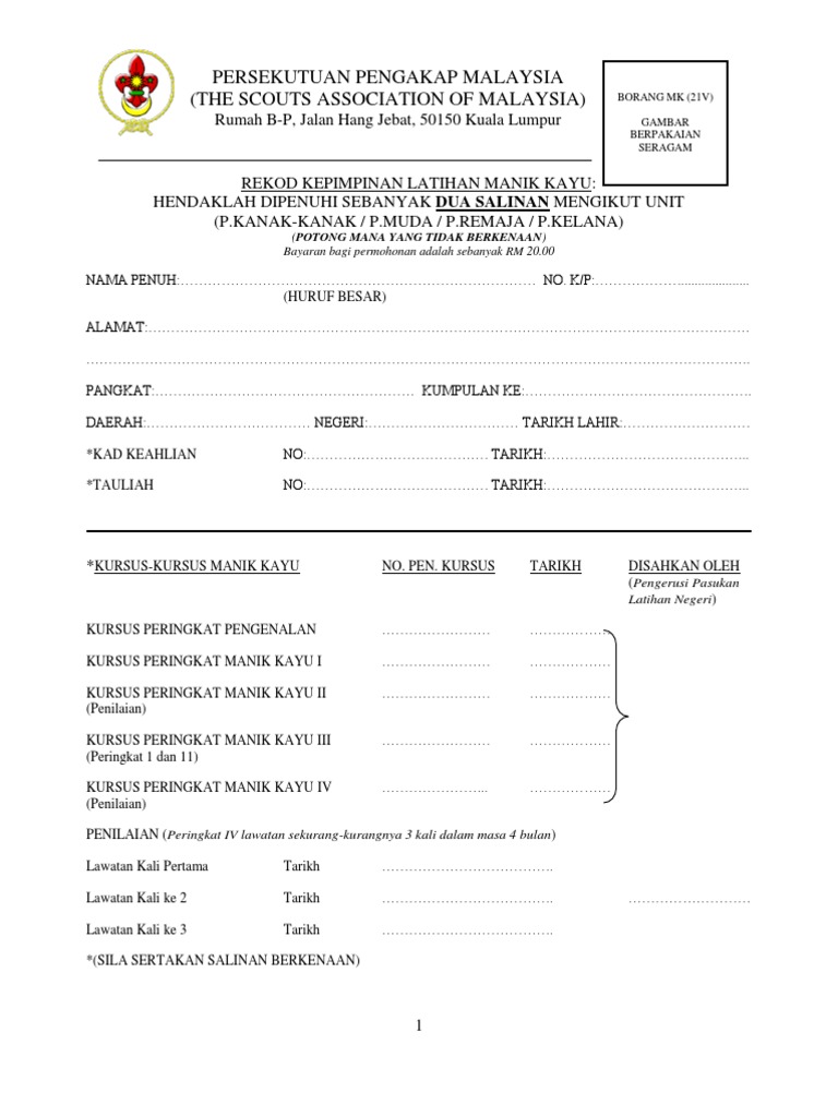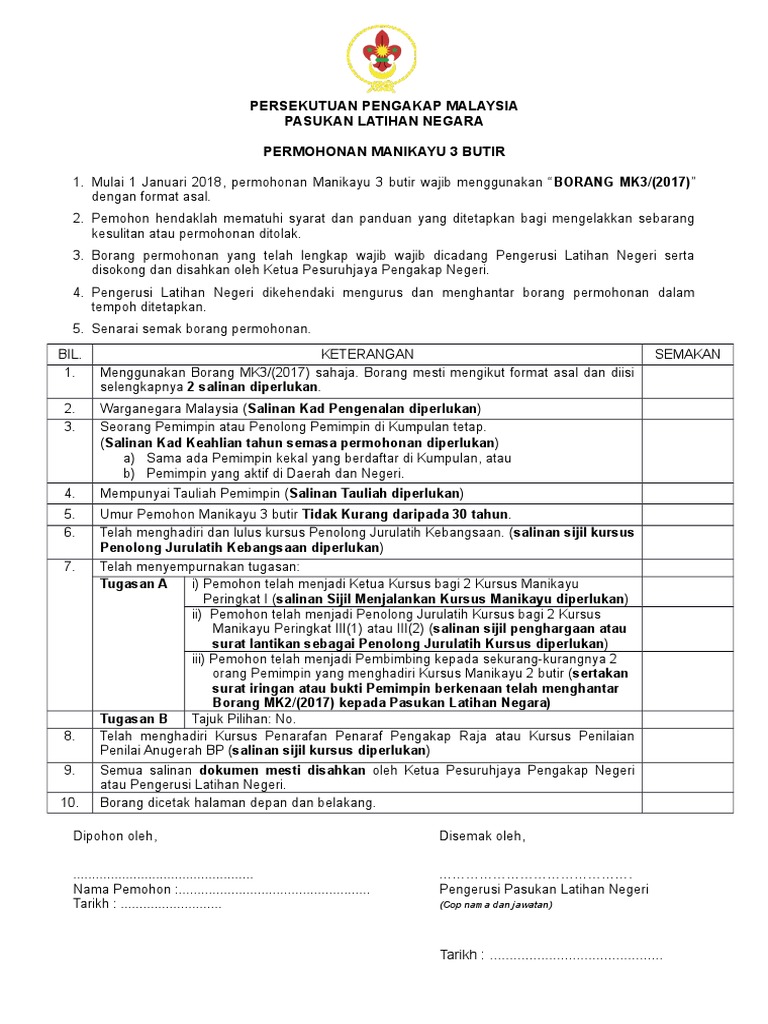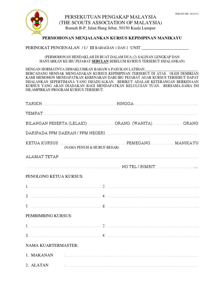 Borang menjalankan kursus kmk peringkat pengenalan i iii bahagian 1 dan 2. Kursus ini dijalankan selama 3 hari 2 malam mengikut unit unit pkk pm pr pk dan peserta diwajibkan tidur di khemah. Borang permohonan manikayu 3 butir. Adalah dimaklumkan bahawa majlis tersebut akan diadakan sebagaimana ketetapan berikut.