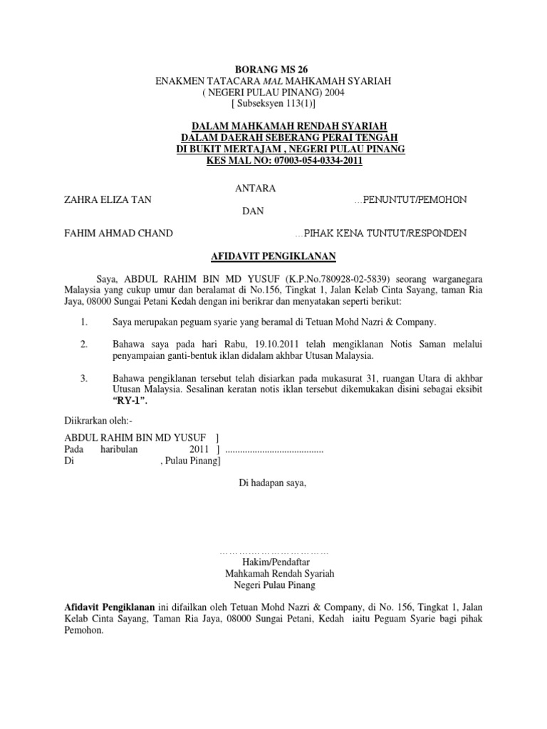 Salinan kad pengenalan pemohon. Borang ms 26 enakmen tatacara mal mahkamah syariah negeri pulau pinang 2004 subseksyen 113 1 bentuk afidavit tajuk am saya nama alamat dan perihalan deponen bersumpah dan menyatakan seperti yang berikut. Borang ms 26 afidavit interim hadhanah. Lady angels last modified by.
