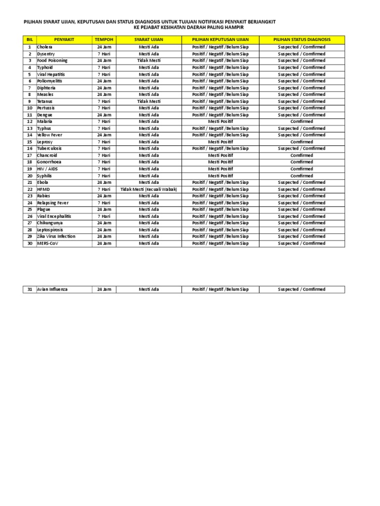 Pemantauan penyakit berjangkit dijalankan secara harian menerusi sistem e notifikasi. Unit ini bertanggungjawab memantau semua jenis penyakit yang tersenarai dalam akta pencegahan dan pengawalan penyakit berjangkit 1988 akta 342 melainkan penyakit bawaan vektor hiv sti dan tb kusta yang dipantau oleh unit yang dikhaskan bagi penyakit tersebut. Notifikasi penyakit berjangkit yang perlu dilaporkan peraturan peraturan pencegahan dan pengawalan penyakit berjangkit borang notis pindaan 2011 selain dari notifikasi bertulis penyakit berikut perlu dinotifikasi melalui telefon dalam tempoh 24 jam iaitu acute poliomyelitis cholera. Format maklumat senarai penolong pegawai perubatan yang ditawarkan pemangkuan mulai tahun 2015 hingga 2018 muat turun borang pengamal perubatan borang avian influenza a h7n9 borang maklumat diri bmd.